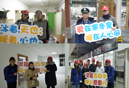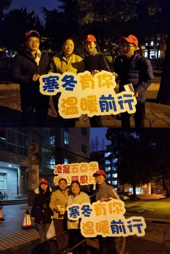在上理工生活的每一分每一秒,都有這樣一群“守護人”不分晝夜地奉獻著、守護著、保障著校園,為我們帶來安全和便利的學習生活環(huán)境。他們就是我們身邊的門衛(wèi)保安、環(huán)衛(wèi)工人、保潔人員、宿管及食堂工作人員等。2019年1月8日凌晨五點半,上海理工大學研究生團委組織研究生志愿者舉辦凌晨五點半暖心感恩上理“守護人”公益志愿活動,以“寒冬有你,溫暖前行”為主題,為這些上理“守護者”送上一份暖心的問候。