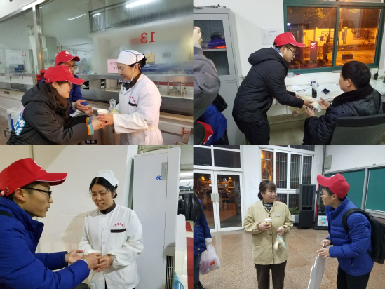 研究生志愿者分為兩組從334校門口出發(fā),給4個校門口的保安室、綜合樓及四教保潔阿姨,南北校主干道的環(huán)衛(wèi)工人,第一、六食堂工作人員以及宿舍樓管阿姨等,送去現(xiàn)沖的濃郁豆奶、熱乎的早餐、實用的保暖小禮物,這一行動深深打動了我們可愛的守護者們。當他們歡喜地拿到這一份份暖心的禮物,露出燦爛笑容的時候,寒冬,不再那么冷了。