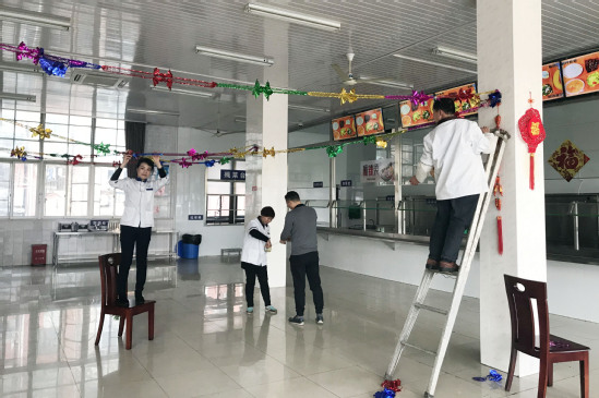“貼上窗花、掛上燈籠,紅紅火火的,這樣看起來才有一個過年的樣子嘛,我自己也有孩子,但是留校過年的這些孩子更需要我來照顧,他們雖然留在學校過年,也要讓他們有在家過年的感覺”,四公寓四號樓的宿管阿姨李玉林一邊貼著窗花,一邊笑著講到。宿舍對于學生來說就是自己的第二個家,為了讓留校過年的同學們也能夠感受到家的溫暖和過年的氛圍,學校相關部門在環境氛圍營造上下功夫,在學生寢室樓和食堂貼上窗花、掛上對聯,在校門口和校園里掛上燈籠,給校園增加了濃濃的年味兒。
