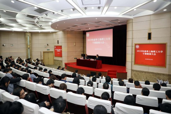 3月13日,2019年春季上海理工大學干部教師大會在綜合樓報告廳召開。全體在校校領導、中層干部,民主黨派、無黨派人士代表,教工支部書記、輔導員、學生校長助理參加會議。會議由黨委書記吳松主持。