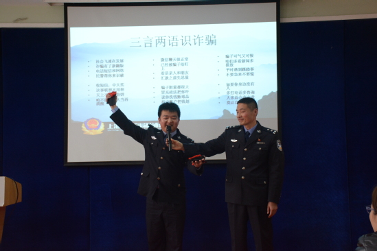 隨后,“網紅”黃超警官、魏海嶺警官通過相聲、快板、演說多形式揭露身邊常見的“套路”。例如將手機驗證碼轉發給他人導致個人錢款被盜,微信陌生人加好友套近乎從而導致個人信息泄露等。兩位警官通過詼諧的語言一一拆穿犯罪分子實施詐騙的慣用伎倆,生動有趣的表演帶動了現場氛圍,引發在場師生的深刻思考。隨后,魏海嶺警官通過案例與視頻教學向大家展示商圈扒竊的常見手法,就當下期間需重點關注的防火防盜防騙防事故等主題安全知識進行專業講解。他指出上下班高峰期、周末節假日、冬末初春是扒手作案的高峰時間段,而擁擠的公交車站、商場、飯店等是主要發生地點,呼吁大家在外出時要結伴而行,財物確保不離開視線。黃超警官圍繞防火安全、國家安全等主題展開分享。關于防火,黃警官通過現場實地教學,講解了滅火器的正確使用方法以及救火原則,糾正了大家平時使用滅火器的誤區。
