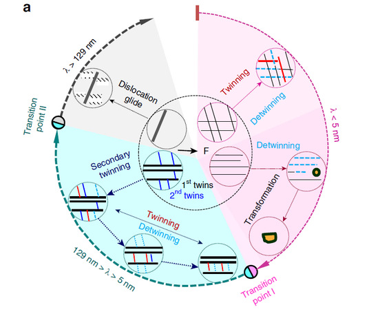 納米孿晶有望解決材料強(qiáng)韌性矛盾這一科學(xué)難題。不同尺度孿晶的變形機(jī)制是控制強(qiáng)度-塑性協(xié)同關(guān)系的主導(dǎo)因素。因此,微納尺度孿晶變形行為的解析對微觀結(jié)構(gòu)的設(shè)計(jì)和高性能材料的制備具有重要意義。本研究工作將透射電鏡下的原位拉伸試驗(yàn)與位錯基理論模型和分子動力學(xué)模擬相結(jié)合,揭示了孿晶變形的尺度效應(yīng),并建立了幾納米到幾百納米孿晶變形圖譜。原位拉伸實(shí)驗(yàn)發(fā)現(xiàn)孿晶變形存在兩個臨界尺度:當(dāng)孿晶尺度小于5 nm時,以一級孿晶的孿晶化和退孿晶化為主;當(dāng)孿晶尺度為5 - 129 nm時,由一級孿晶變形轉(zhuǎn)變?yōu)槎墝\晶變形;當(dāng)孿晶尺度大于129 nm時,以一級孿晶內(nèi)部的位錯運(yùn)動為主。力學(xué)模擬和分子動力學(xué)模擬結(jié)果與原位觀察的尺度效應(yīng)高度一致,闡明了由不全位錯滑移引起的內(nèi)稟機(jī)制和演變過程。該工作對于先進(jìn)高強(qiáng)高韌鋼的結(jié)構(gòu)設(shè)計(jì)和輕量化應(yīng)用有重要意義。該工作得到國家自然科學(xué)基金委、上海市科委項(xiàng)目資助。