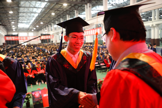 在熱烈的掌聲中,學位授予儀式開始。意氣風發的畢業生依次走上主席臺,從主席臺領導、院士手中莊嚴接過學位證書,接受撥穗,隨著流蘇自右至左輕輕撥過臉龐,一次握手、一個微笑、一聲祝福,收獲的喜悅在這一刻悄然定格。這是他們人生中值得永遠銘記的時刻,同時也為難忘的研究生求學經歷劃上圓滿的句號,從此開啟了人生新的篇章。