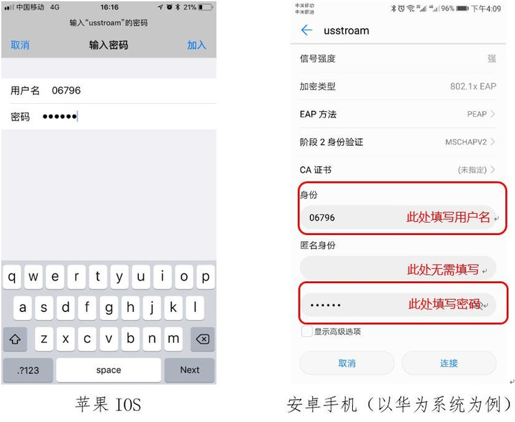 在學校無線覆蓋區域連接usstroam無線網絡,按如下格式輸入用戶名和密碼