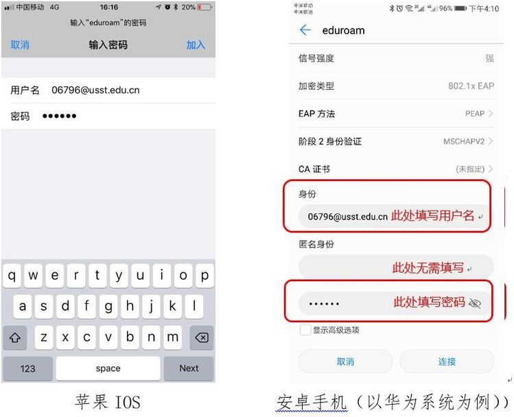 A:usstroam在上海理工大學校內覆蓋,eduroam覆蓋了國內外幾千所教育和科研機構,使用eduroam時用戶名需要增加輸入@usst.edu.cn的后綴。