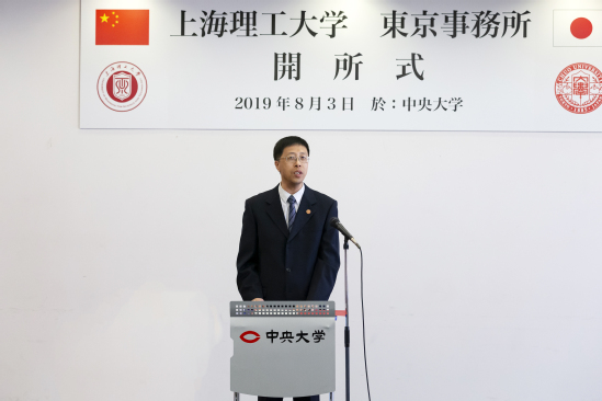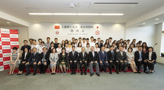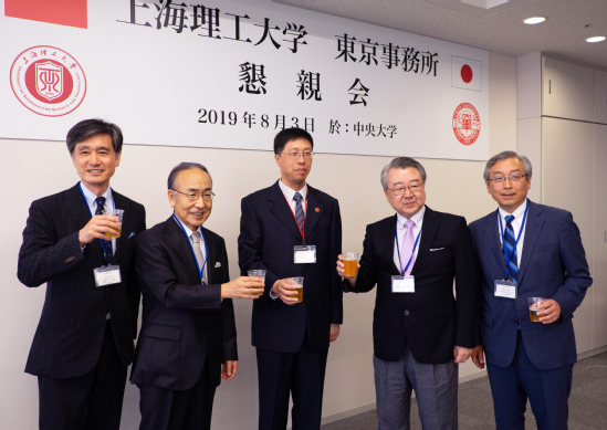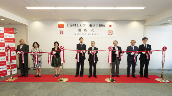 代表團第三站到訪日本中央大學,與日方共同舉辦上海理工大學東京辦公室成立儀式。日本中央大學總長酒井正三郎、校長福原紀彥、樫山和男理工學部部長、白井宏國際中心所長,我校在日的校友代表、暑期日本游學交流的學生代表團,以及中央大學的師生代表參加了成立儀式。吳堅勇、酒井正三郎總長、福原紀彥校長等共同為東京辦公室成立剪彩。成立儀式后,雙方代表舉行了簡短熱烈的懇親會。