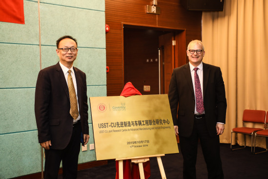 10月17日上午,上海理工大學與英國考文垂大學(Coventry University)在圖文信息中心第一會議室舉行了“USST-CU先進制造與車輛工程聯合研究中心”簽約與揭牌儀式。副校長劉平教授、考文垂大學副校長Richard Dashwood教授出席儀式。考文垂大學未來交通與城市研究所負責人、工程環境與計算機學部負責人等6名教授代表考文垂大學前來參加,國際交流處、宣傳部、研究生院、科技處、管理學院、出版印刷與藝術設計學院相關負責人、機械工程學院車輛工程負責人及部分師生參加儀式。儀式由機械工程學院院長李郝林教授主持。