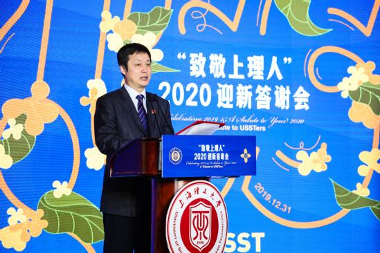 校長丁曉東代表學校黨政發表熱情洋溢的新年賀詞。他以“豐收”為關鍵詞,總結了學校一年來在人才培養、學科科研、隊伍建設、開放協同、管理服務等方面的突出成績,表達了對關心、支持、推動學校事業發展的各級領導、各界友人、海內外校友、全體師生的崇高敬意和美好祝福。丁曉東指出,每一位上理人都是學校改革發展可以依靠的最廣泛、最堅實的力量,匯聚成上理奔騰不息的時代洪流,鳴奏出激蕩奮進的澎湃強音。他號召全體上理人,共同攜手,以習近平新時代中國特色社會主義思想為指導,以舍我其誰的擔當、勇立潮頭的毅力,不忘初心、牢記使命,邁步偉大事業,書寫時代華章,向著共同的“上理夢”奮勇前進,朝著建成“特色顯著的一流理工科大學”的目標不懈奮斗。