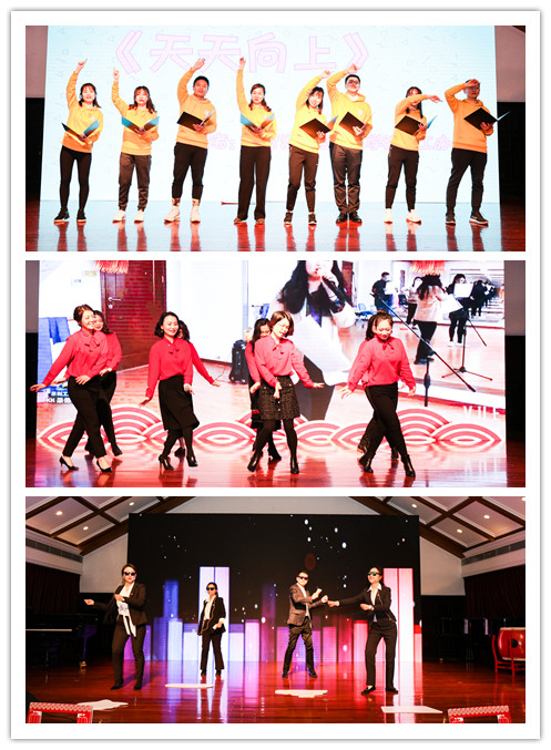 交流暨聯歡會以“學思踐悟”、“工貴求實”、“仁愛之心”、“致敬學工人”為主題分為四個篇章,彰顯了新時代參與和支持學生工作的上理人所具有的飽滿熱情與昂揚面貌。在“學思踐悟”篇章,歌舞《天天向上》用青春和活力傳遞正能量;《時光來電》融入青春元素,回顧年代金曲;《加班陣線聯盟》則以詼諧幽默的表演形式,展現學工人平凡崗位上的不平凡。在“工貴求實”篇章,歌舞串燒《流金歲月》體現了學工隊伍的團結拼搏與積極進取;抖肩舞《COINCIDENCE》融入學工人的日常工作,抖出了青春活力與無限創意;戲曲串燒《東南西北大拜年》則將西北民歌、通俗歌曲、豫劇、黃梅戲融為一體,呈現優秀傳統文化特色。在“仁愛之心”篇章,一曲《我愛你,中國》唱出了學工人對祖國母親的深情和對育人使命的擔當;舞蹈串燒《舞動中英夢》傳遞了學工人舞動青春、堅守夢想的初心使命;合唱曲目《不忘初心》則將全場氛圍引向高潮,不忘初心、繼續前進的奮斗理念,激勵全場學工人在新的一年再創佳績。