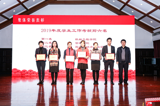 丁曉東為2019年度學院學生工作考核前六名——機械工程學院、管理學院、能源與動力工程學院、醫療器械與食品學院、材料科學與工程學院、環境與建筑學院頒發榮譽獎牌,勉勵全體學工人在2020年勤勉不懈、礪行致遠,愿大家奮進新時代、永當早行人!