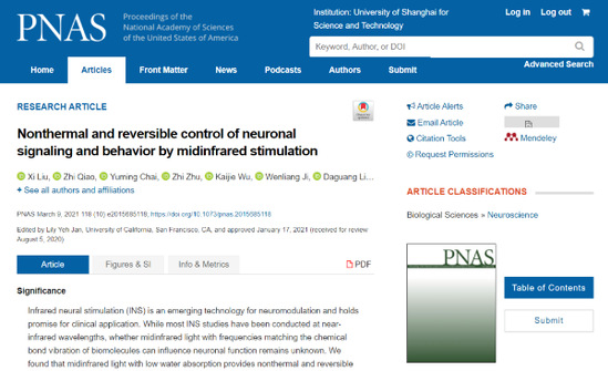 日前,由上海理工大學未來光學實驗室宋波課題組聯合復旦大學腦科學轉化研究院舒友生課題組、中國科學技術大學溫泉課題組、國防科技創新研究院常超課題組、中科院化學所毛蘭群課題組共同完成了一項研究——通過中紅外刺激實現神經信號與動物行為的非熱、可逆調控,首次從理論和實驗雙重角度發現并提出了神經信號和腦功能調控的新機制和新策略。