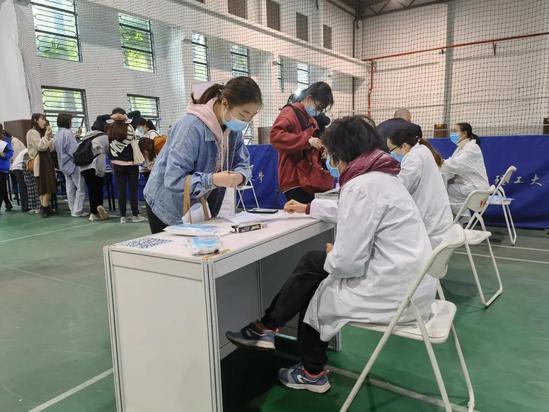 從早上8點(diǎn)開始,師生們按照學(xué)院,分時(shí)段、分批次來到接種點(diǎn),排隊(duì)掃碼登記進(jìn)場。隨后在工作人員的指導(dǎo)下,大家嚴(yán)格按照流程完成疫苗接種。記者注意到,在預(yù)檢區(qū),醫(yī)務(wù)人員會仔細(xì)詢問師生身體狀況,如“你最近有什么不舒服嗎?有吃過藥嗎?今天有喝過酒嗎?有對什么過敏嗎?”等等,來判斷其是否符合接種條件。