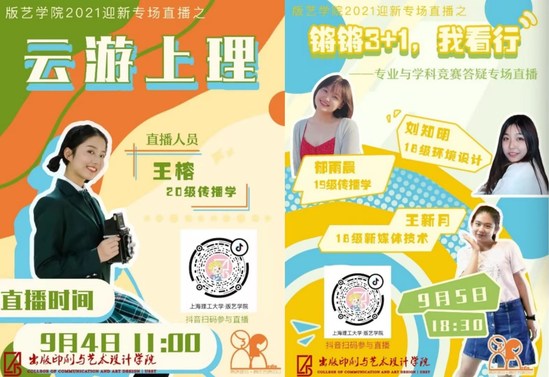 上海理工大學版藝學院舉辦線上迎新直播活動,采用老友圓桌談的形式,三位在高級別創新創業賽事中屢獲佳績的學姐通過《鏘鏘三加一 我看行》專業與學科競賽答疑專場直播向新生答疑解惑,播下創新創業的種子。
