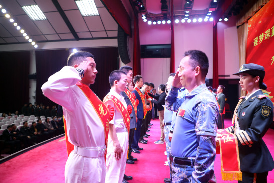 現場,應邀從山東青島趕來參加主題活動的逐夢深藍講師團成員和教師代表,共同為2021年退伍大學生佩戴綬帶。30名退伍大學生依次以洪亮的聲音報出他們原部隊番號:“中國人民解放軍92132部隊張楠!(海軍青島艦原副艦長)”“中國人民解放軍91091部隊袁興池!”“中國人民解放軍駐香港部隊簡濤!”“武警海警總隊浙江支隊董向峰!”……聲浪震天,回蕩在禮堂上空,也激蕩在每一位師生心中。