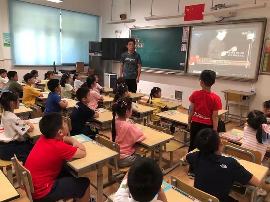 在黃浦區盧灣一中心小學,德育教導助理顧煒老師給二年級學生上道法課時,結合課本中《歡歡喜喜迎國慶》的內容,他詳細給學生們介紹了我國烈士紀念日的由來。
