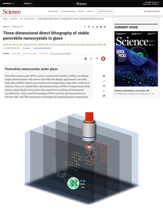 研究成果以《玻璃中穩定的鈣鈦礦納米晶體三維直寫》(Three-dimensional direct lithography of stable perovskite nanocrystals in glass)為題發表在《科學》正刊,論文共同第一作者為浙大光電學院博士生孫軻、之江實驗室PI譚德志、上海理工大學副教授方心遠。“很多頂尖的科研成果其實都離不開這種跨學科、跨學校甚至跨國的合作交流”,顧敏院士介紹,“我們上理工團隊深耕全息領域,浙大團隊則在光學材料以及飛秒激光與材料的相互作用方面有深厚的積累,合作成果再次證明了這種科研方式在實現‘0到1’突破中的重要性。”