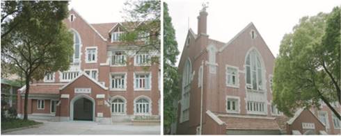 馥賚堂為磚混結構,假四層坡屋面,兩個入口門廳,分別為三角山墻和雉堞墻樣式。白色仿石線窗套,底層窗洞為哥特式,二層以上簡化為現代式。曾用作女生宿舍。