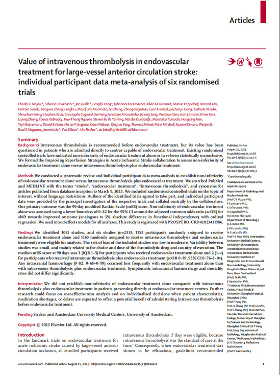 近年來,隨著深入開展臨床研究,動脈取栓已被認為是前循環大血管閉塞性急性缺血性卒中的最有效標準治療方法。這一方法明顯改善患者的臨床結局并減少殘留癥狀,但是否需要在動脈取栓(EVT)之前進行靜脈溶栓(IVT)一直存在國際爭議,因為靜脈溶栓可能增加出血風險、延遲取栓時間并增加治療成本等問題。因此,全球各地的研究人員紛紛展開高質量的臨床研究以解決這一問題。到目前為止,全球已有六項關于這一問題的高質量臨床研究發表在國際著名期刊上。然而,由于這些研究在設計、入組數量、研究人群和基線數據等方面存在差異,六項研究的結果并不一致。因此,迫切需要進行基于高質量的隨機對照試驗研究(RCT)個體數據的綜合分析,以獲得更高級別的循證醫學證據,這將有助于指導全球卒中治療實踐。