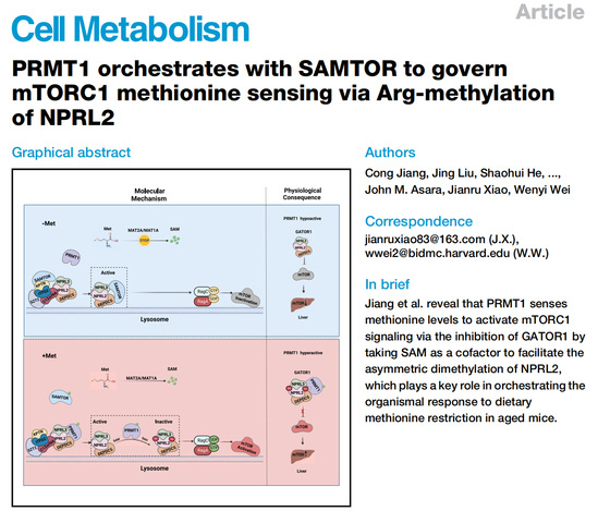 該研究報道了PRMT1(蛋白精氨酸甲基轉移酶1)通過直接感知細胞內S-腺苷蛋氨酸(SAM)水平對甲硫氨酸介導的mTORC1激活至關重要。在甲硫氨酸充足的條件下,升高的細胞質SAM使mTOR復合物中MTORC1上游的S-腺苷甲硫氨酸傳感器(SAMTOR)與GATOR1復合物分離,而GATOR1復合物與蛋白質精氨酸甲基轉移酶1(PRMT1)相互作用使NPRL2基因甲基化,從而抑制了GATOR1的G蛋白G活性,導致mTORC1活化。更重要的是,PRMT1 -NPRL2-mTORC1軸在調節老年小鼠對甲硫氨酸限制飲食誘導的胰島素抵抗以及腫瘤的發生發揮了關鍵作用,證明了PRMT1可以作為mTORC1信號的生理SAM傳感器。