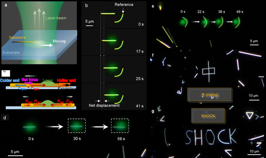 捕獲(Trapping)特性是激光操控技術的核心,因為它可以通過光斑位置來掌握粒子的動向,實現任意的運動控制,而不僅僅止步于缺乏控制的致動(Actuation)。金納米線在532nm納秒脈沖的高斯型光斑作用下,會向光斑內部移動,直到納米線的中心與光斑中心一致,這是一個典型的捕獲過程。研究人員通過理論分析,找到了光熱沖擊驅動力的物理來源,因表達式中包含溫度梯度,因此該力被稱為光熱梯度力。當移動光斑時,光熱梯度力分布平衡被打破,納米線重新向光斑中心移動,一直重復該過程,納米線就會隨著光斑一直軸向移動。另外對被捕獲在光斑中央的納米線,提高激光功率將會使納米線兩端受到更大光熱梯度力擠壓而側向彎曲,從而實現側向移動。這樣就實現了納米線在二維平面上的任意運動。如下圖展示了研究團隊將多根納米線拼成漢字“沖”和英文單詞“SHOCK”的圖案。