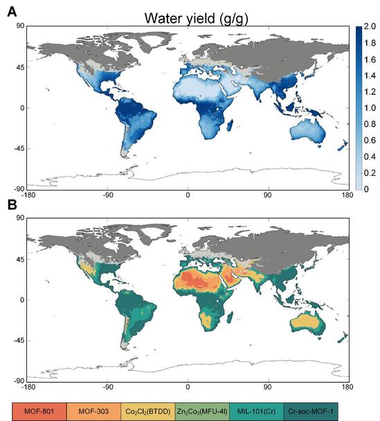 該研究分別從取水能力和能量需求兩方面入手,基于熱力學、氣象學理論建立了可靠的取水系統模型,對金屬有機框架(MOFs)進行全球應用潛力分析;結合全年高分辨率全球氣象數據,為金屬有機框架空氣取水裝置的高效部署提供了指導。最終建立了吸附劑適用基準,可為特定地區特定氣候的吸附式空氣取水技術提供了評估,并證明了空氣取水技術在干旱地區的可靠性。