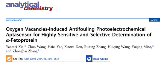 近期,上海理工大學辛艷梅老師、繆煜清教授聯合華東師范大學張中海教授報道了一種基于氧空位調控的抗污型光電化學傳感器,實現了血清和尿液中甲胎蛋白的高靈敏度和選擇性檢測。相關成果以“氧空位調控的抗污型光電化學適配體傳感器用于甲胎蛋白的高靈敏度和高選擇性測定(Oxygen Vacancies-Induced Antifouling Photoelectrochemical Aptasensor for Highly Sensitive and Selective Determination of α Fetoprotein)”為題發表在國際化學權威雜志《分析化學》(Analytical Chemistry)上。辛艷梅老師為第一作者,辛艷梅老師、繆煜清教授、張中海教授為通訊作者,上海理工大學為第一單位。