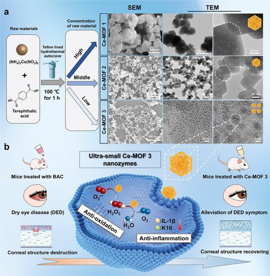 據了解,利用廣譜抗氧化劑消除活性氧可能是一種可行的干眼病治療方法,具有超小粒徑(如粒徑<10 nm)的納米顆粒通常表現出更高的藥物遞送、活性氧清除和治療效果。受此啟發,李貴生教授團隊研發出了一種工程化的超小型鈰基金屬有機框架(Ce-MOFs)納米酶。選用水熱合成法,分別以硝酸鈰銨和苯二甲酸作為鈰源和有機配體,成功設計出了不同粒徑的Ce-MOFs。這種Ce-MOFs能夠模擬超氧化物歧化酶和過氧化氫酶的功能,有效清除眼部過量的活性氧。更重要的是,粒徑為2-3納米的Ce-MOFs納米酶能有效穿透眼組織,進入常規藥物難以到達的深部組織,從里到外更充分地發揮抗氧化作用,進而加速受損角膜上皮的修復過程。論文一經發表即引起了學術界和公眾的廣泛關注,中新網、光明網、新浪網、網易、鳳凰網、文匯報、新民晚報、騰訊網、科學網等主流媒體都進行了專題報道或轉載評論。