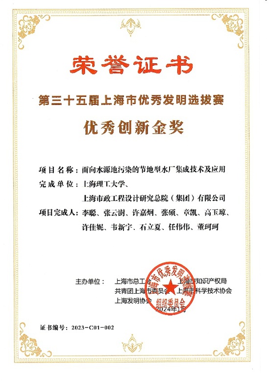 隨著現(xiàn)代工業(yè)的推進(jìn),污染物遷移和變化也導(dǎo)致新的水污染問題層出不窮,對生活用水水質(zhì)的把控也就成了重中之重。對此,李聰團隊和上海市政工程設(shè)計研究總院(集團)有限公司合作開發(fā)了針對水源地污染的節(jié)地型水廠集成技術(shù),不僅能有效降低水耗、濾料和藥劑損耗,提高了處理效率,還減少了水廠的用地面積,實現(xiàn)了水處理工藝節(jié)能降耗和給水廠污泥減量化。最終,團隊?wèi){借項目“面向水源地污染的節(jié)地型水廠集成技術(shù)及應(yīng)用”,獲“第三十五屆上海市優(yōu)秀發(fā)明選拔賽優(yōu)秀創(chuàng)新金獎”,相關(guān)研究成果已推廣于西安、杭州、常州、上海、青島、鄭州、蘇州和湖州等地,出廠水水質(zhì)不僅達(dá)到國家標(biāo)準(zhǔn),生物穩(wěn)定性、口感等提升明顯,而且大幅減少土地征用投資和建設(shè)成本。