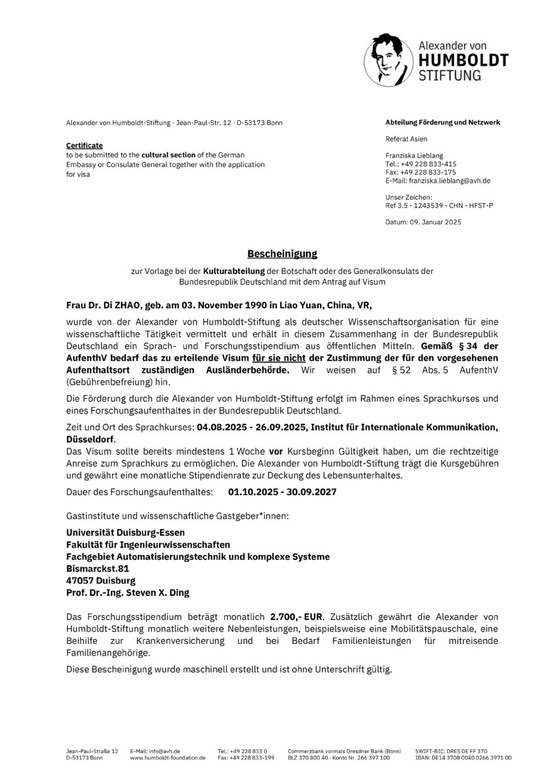 1月9日,德國洪堡基金會(Alexander von Humboldt Foundation)發來正式授權信,管理學院系統科學系副研究員趙迪入選德國洪堡基金會“洪堡學者”,獲得德國洪堡基金會資助與“洪堡學者”(Humboldt ResearchFellowship)榮譽稱號。該項目的邀請合作方為德國杜伊斯堡—埃森大學(University of Duisburg-Essen)教授Steven X. Ding。