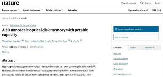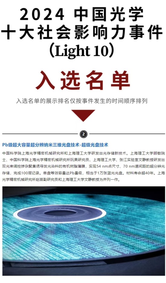 近日,根據“中國光學”微信公眾號發布的消息,我校科技成果“Pb級超大容量超分辨納米三維光盤技術——超級光盤技術”(A 3D nanoscale optical disk memory with petabit capacity),入選“2024中國光學十大社會影響力事件”(Light10)。該成果于2024年2月22日刊登于《自然》雜志,央視2月23日予以報道。