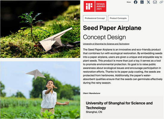 此次獲獎作品涵蓋環保教育和醫療關懷兩個領域,作品分別名為《種子紙飛機(Seed Paper Airplane)》《月相胰島素注射筆(Luna phase stamp insulin pen injection)》。