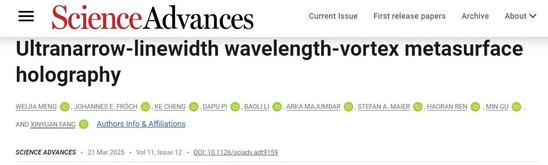 近日,上海理工大學顧敏院士、方心遠研究員團隊聯合澳大利亞、美國等頂尖實驗室,在《科學進展》(Science Advances)上發表題為“超窄線寬波長-渦旋復用超表面全息術”(“Ultranarrow-linewidth Wavelength-Vortex Metasurface Holography”)的研究論文。該技術將人工智能技術與超表面全息術相結合,不僅實現了單張全息圖重建118幅獨立圖像,創下入射光2納米的超窄線寬紀錄,更為光學加密技術樹立新標桿。論文第一作者是智能科技學院孟維佳同學與美國華盛頓大學Johannes E. Fr?ch博士。論文通訊作者為上海理工大學顧敏院士、方心遠研究員以及澳大利亞莫納什大學任浩然研究員。