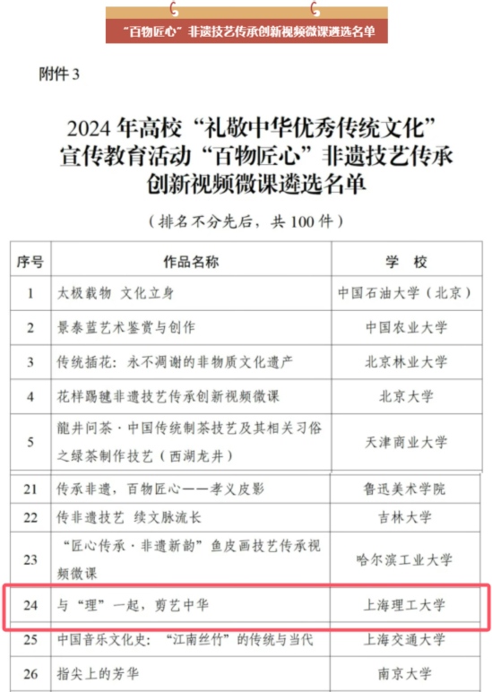 近日,教育部公布2024年高校“禮敬中華優(yōu)秀傳統(tǒng)文化”宣傳教育活動(dòng)結(jié)果,由我校黨委宣傳部、中英國(guó)際學(xué)院聯(lián)合申報(bào)的《與“理”一起,剪藝中華》作品成功入選“百物匠心”非遺技藝傳承創(chuàng)新視頻微課。