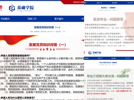 “重選專業的申請條件是什么”“怎么提前了解課程具體內容”“怎么入黨”……這些困惑著2024級學生的問題,近期出現在基礎學院官網的知識問答里。開展深入貫徹中央八項規定精神學習教育以來,基礎學院深入領會習近平總書記關于加強黨的作風建設的重要論述;召開黨委會,全面梳理工作、查擺問題;開展黨支部例會,細致排查基層工作薄弱點,努力做到查有力度,并以“馬上就辦”的高效行動,提升關心關愛學生能級。