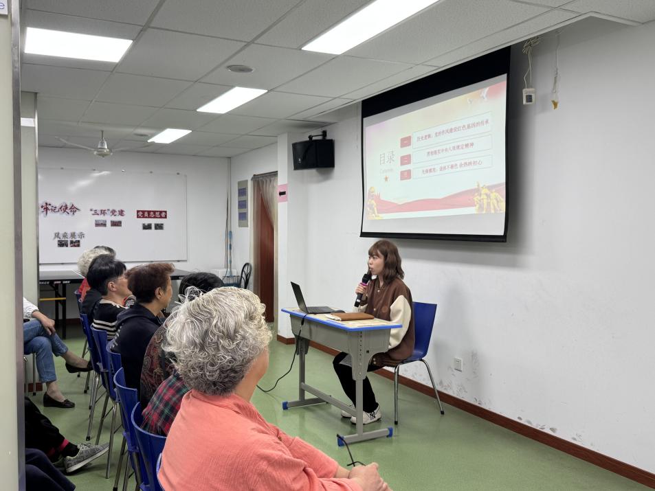 隨后,張子晗作主題為“黨的作風建設——中央八項規定精神鍛造百年大黨新風骨”的理論宣講。她從歷史邏輯、貫徹落實以及先鋒模范三個方面為各位黨員講述中央八項規定精神。她以社區實例向各位老黨員介紹如何從身邊小事做起,并發出倡議。