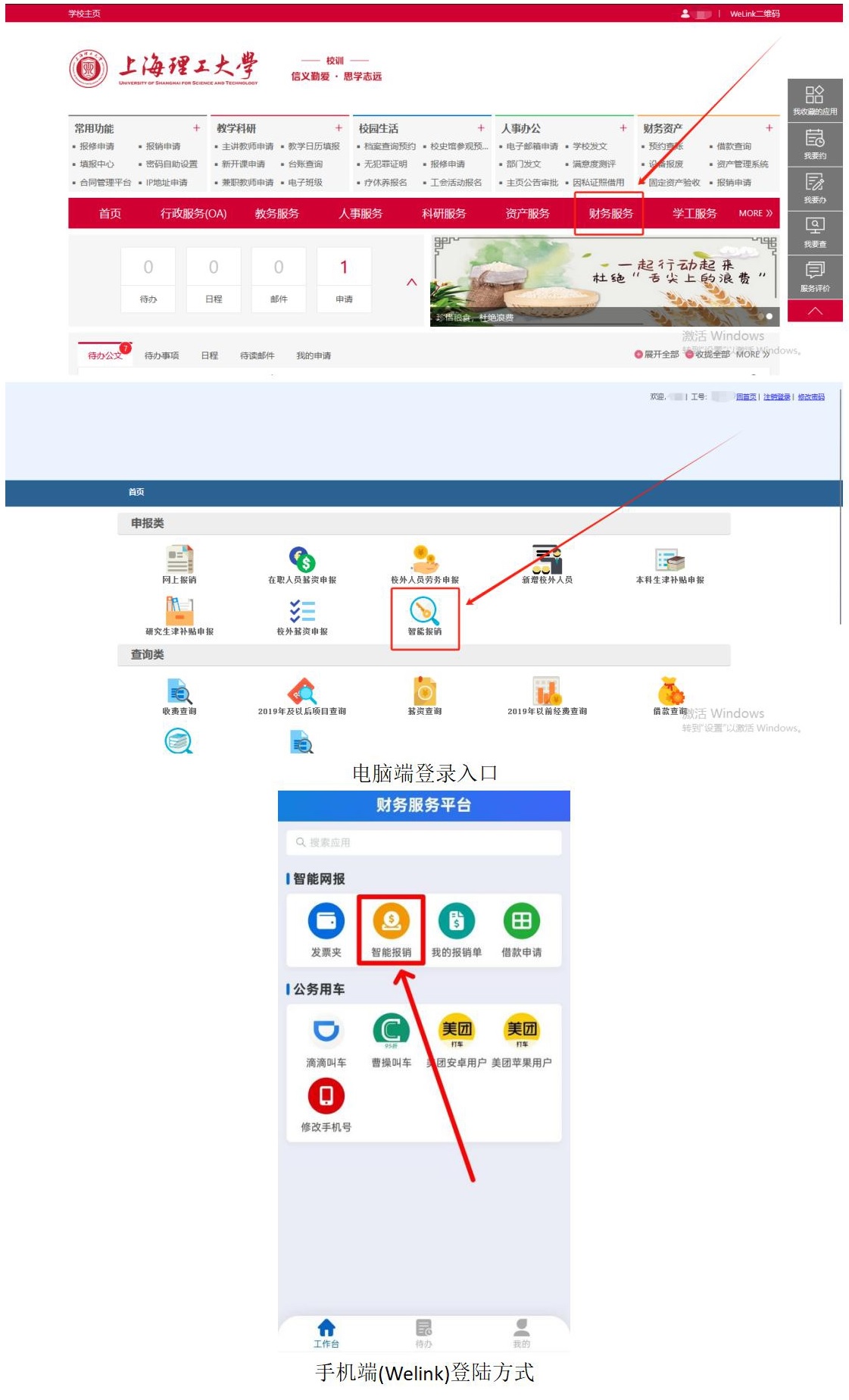 從學校官網首頁右上方【信息門戶】入口訪問→【財務服務】→點擊【智能報銷】進入;移動端Welink中,搜索 【財務平臺】→點擊【智能報銷】進入。