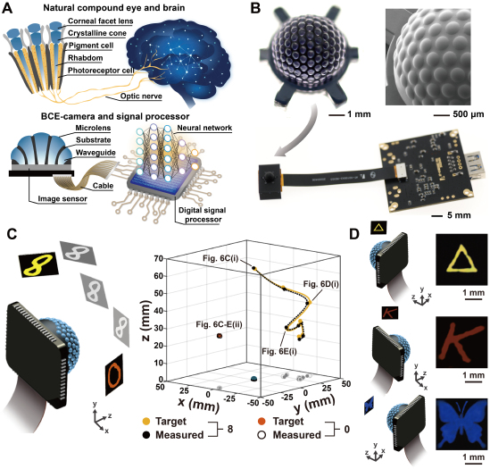 仿生視覺系統及成像效果。A 節肢動物視覺系統和仿生視覺系統;B 仿生復眼及視覺系統的實物圖;C,D利用仿生視覺系統進行目標成像和定位
