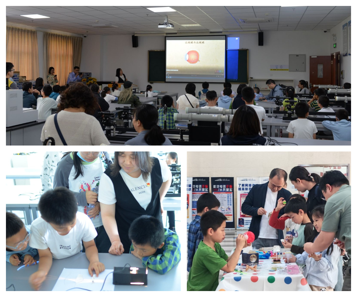 在光電信息實驗中心教師志愿者的引導下,大家有序參觀了本科實驗教學中心。在方寶英老師的指導下,小朋友們進行了“近視眼和遠視眼的形成及其矯正”光學趣味小實驗。小朋友們不僅輕松理解了光學矯正的原理,更深刻意識到保護視力的重要性。此外,“顯微鏡”“潛望鏡”“投影燈”“臺燈”等生活中常見物品的光學原理探究活動,小朋友們通過動手組裝直觀感受到光學反射、折射原理在日常生活中的應用,鍛煉了動手能力和創造力,深刻體會到了“科技讓生活更美好”的真諦。