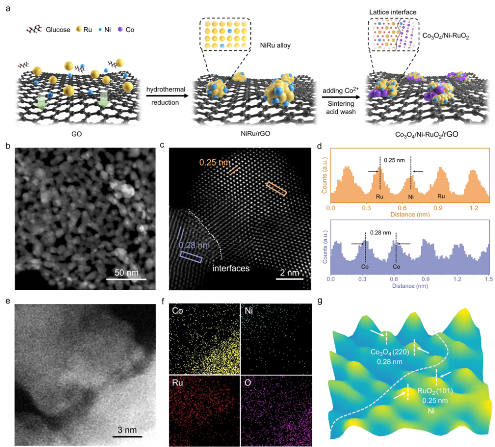 針對以上難題,楊偉偉等帶領研究生劉鑫洋、王志軍和雷鵠旭等創新性地采用以下方案:一是利用納米膠島效應,通過原位定向生長技術實現單原子鉑在氧化鈰膠島表面局部密度的有效調控;二是采用價格相對低廉的釕(US$8,090/kg)代替鉑,通過硼和氧雙原子實現釕配位環境的有效調控與電子轉移;三是通過鎳原子摻雜二氧化釕和氧化鈷作為犧牲劑的策略,提高催化劑產氫效率的同時,有效抑制了二氧化釕的氧化溶解。