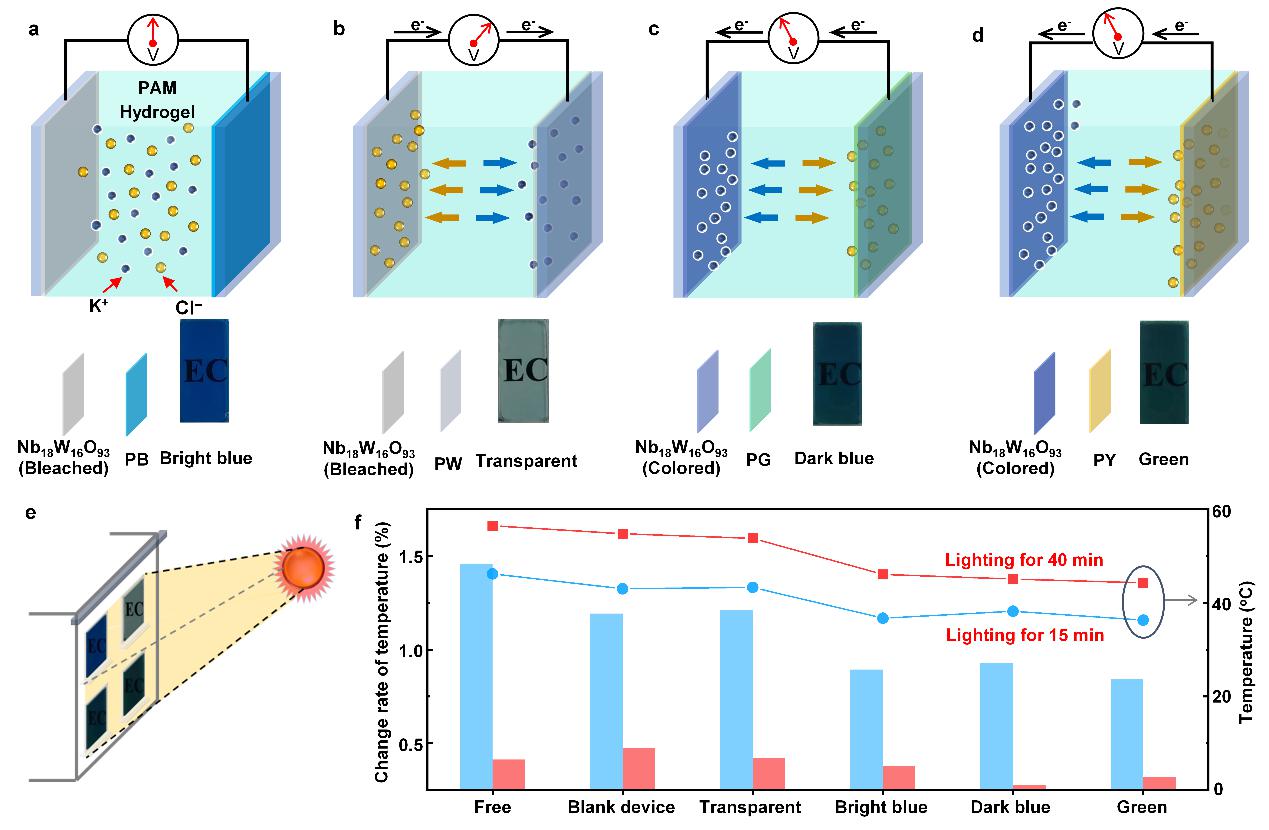 通常,電致變色智能窗是通過離子在材料中的嵌入/脫出,伴隨著電子的轉移,來實現著色態和褪色態的切換。然而,現有的研究長期局限于“搖椅式”的陽離子(如H?、Li?、Zn2+)的嵌入/脫出機制,而忽視了陰離子的作用,導致相關機理不清晰。為此,研究人員首次證明了陰離子(F-、Cl-、Br-、SO42-)可以在普魯士藍薄膜中嵌入與脫出,并設計了基于普魯士藍和鈮鎢雙金屬氧化物(Nb18W16O93)的電致變色器件,其中變色源于K+的嵌入與脫出。