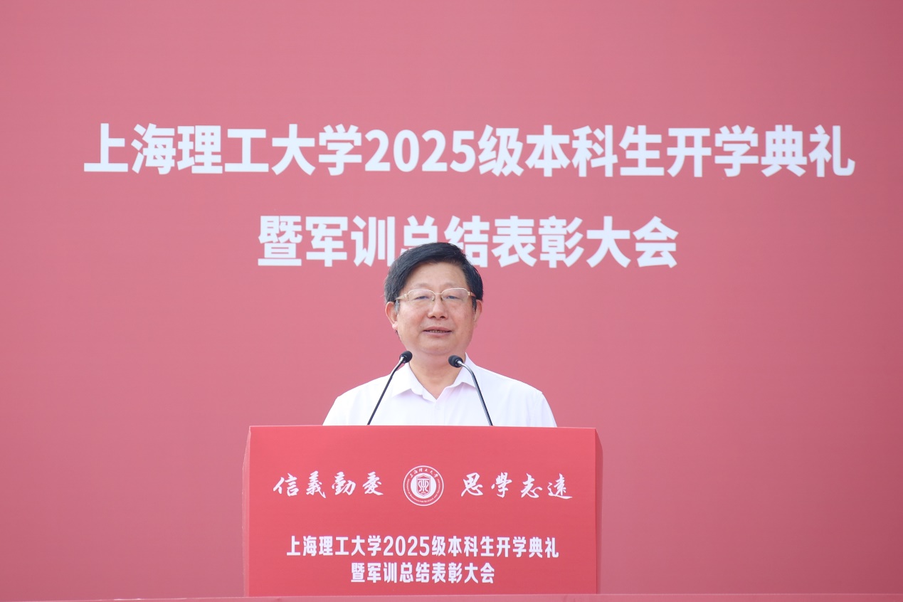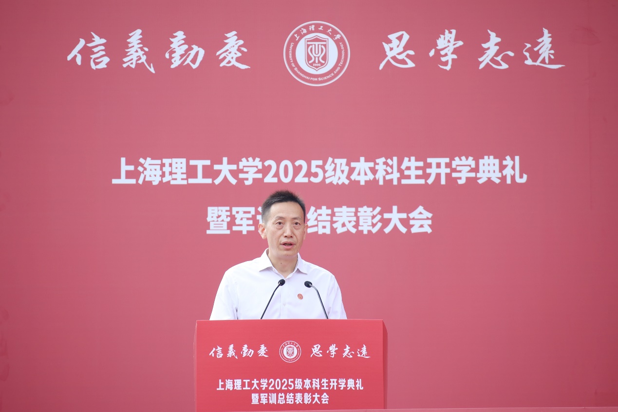 校長朱新遠以“敢為人先,追求卓越”為題勉勵新生。他向2025級新同學表示熱烈歡迎,向辛勞付出的承訓教官們表示衷心的感謝。適逢中國人民抗日戰爭暨世界反法西斯戰爭勝利80周年,朱新遠在講話中深情回顧了建國初期上理人不畏艱難、報國圖強的辦學歷程。他勉勵新同學一要秉持“敢探未知”的鉆勁,筑牢卓越之基。充分利用學校搭建的成長支持體系,既要讀好“有字之書”,打牢專業基礎,又要讀好“無字之書”,提升動手能力;二要懷抱“敢破邊界”的闖勁,拓展卓越之界。面對社會發展的時代背景,要敢于打破邊界,跨界融合,激活創新動能;三要傳承“勇擔使命”的干勁,把握卓越之機。面臨建功立業的人生際遇和國家所需,錨定產業痛點和行業前沿,以實際行動和家國情懷,實現自己的卓越價值。