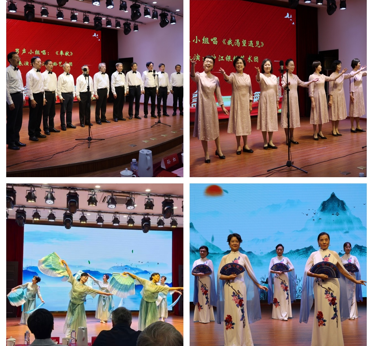 文藝表演中,“滬江銀齡藝術(shù)團(tuán)”帶來(lái)的男聲小組唱《奉獻(xiàn)》,以深情豪邁的歌聲唱出老同志對(duì)校園的熱愛與奉獻(xiàn)情懷;女生小組唱《我渴望遇見》,用優(yōu)美旋律表達(dá)對(duì)校園生活的眷戀與美好生活的向往;舞蹈與走秀《穿越時(shí)空的思念》融合優(yōu)雅與時(shí)尚,展現(xiàn)老同志活力風(fēng)采。活動(dòng)最后,校領(lǐng)導(dǎo)、退休局級(jí)干部代表與全體演出人員、在場(chǎng)老同志齊聲合唱《紅星歌》,熟悉的旋律回蕩現(xiàn)場(chǎng),紅色初心與校園情懷在歌聲中交融,將活動(dòng)氛圍推向高潮。