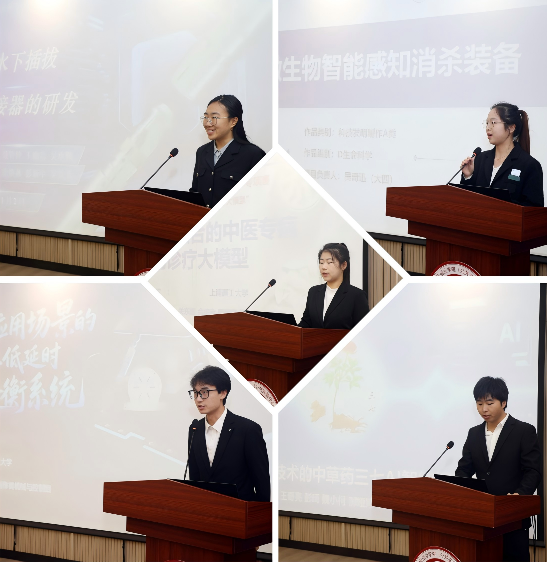 會(huì)上,校團(tuán)委負(fù)責(zé)人介紹了賽事組織與項(xiàng)目培育情況。來(lái)自光電學(xué)院、管理學(xué)院、健康學(xué)院、理學(xué)院的三個(gè)主賽道、兩個(gè)人工智能+專項(xiàng)賽入圍項(xiàng)目團(tuán)隊(duì)依次進(jìn)行了現(xiàn)場(chǎng)展示,涵蓋深海光纖連接、智能消殺、中醫(yī)診療大模型等多個(gè)前沿領(lǐng)域,展現(xiàn)了上理學(xué)子扎實(shí)的科研實(shí)力與創(chuàng)新活力。