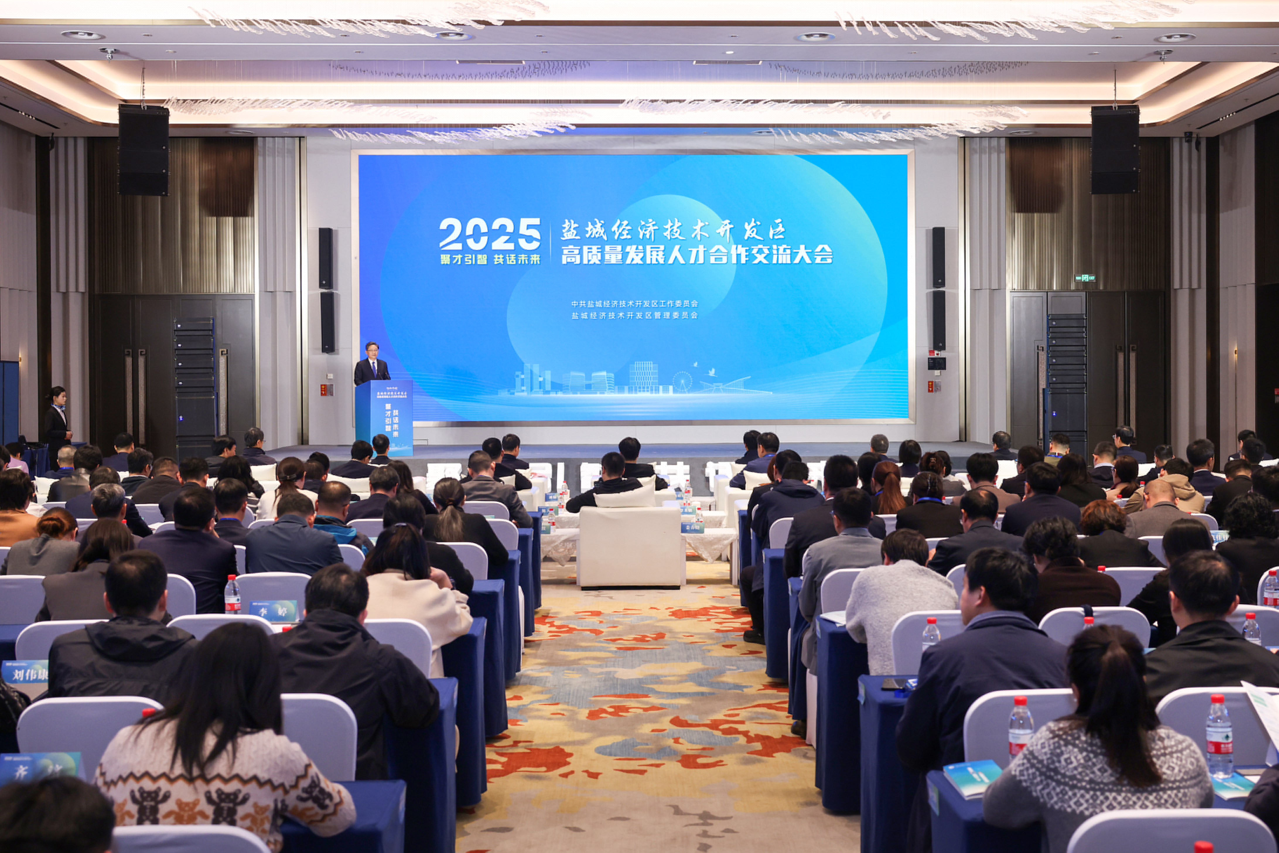11月8日,學校參加2025年鹽城經開區高質量發展人才合作交流活動,與鹽城經濟技術開發區(以下簡稱“鹽城經開區”)共建校地合作引才工作站并舉行授牌儀式。此次活動以“聚才引智、共話未來”為主題,匯聚了來自全國高校院所、國家重大人才工程入選者、省市級高層次人才等200余位專家代表,共商區域發展大計,共筑人才合作新高地。鹽城經開區黨工委書記、管委會主任顧明東,鹽城市人力資源和社會保障局黨委委員、副局長王猛,鹽城經開區黨工委副書記董玲玲等領導和嘉賓出席。我校學生工作部(處)副部(處)長、學生就業指導中心主任馮磊代表學校出席活動。