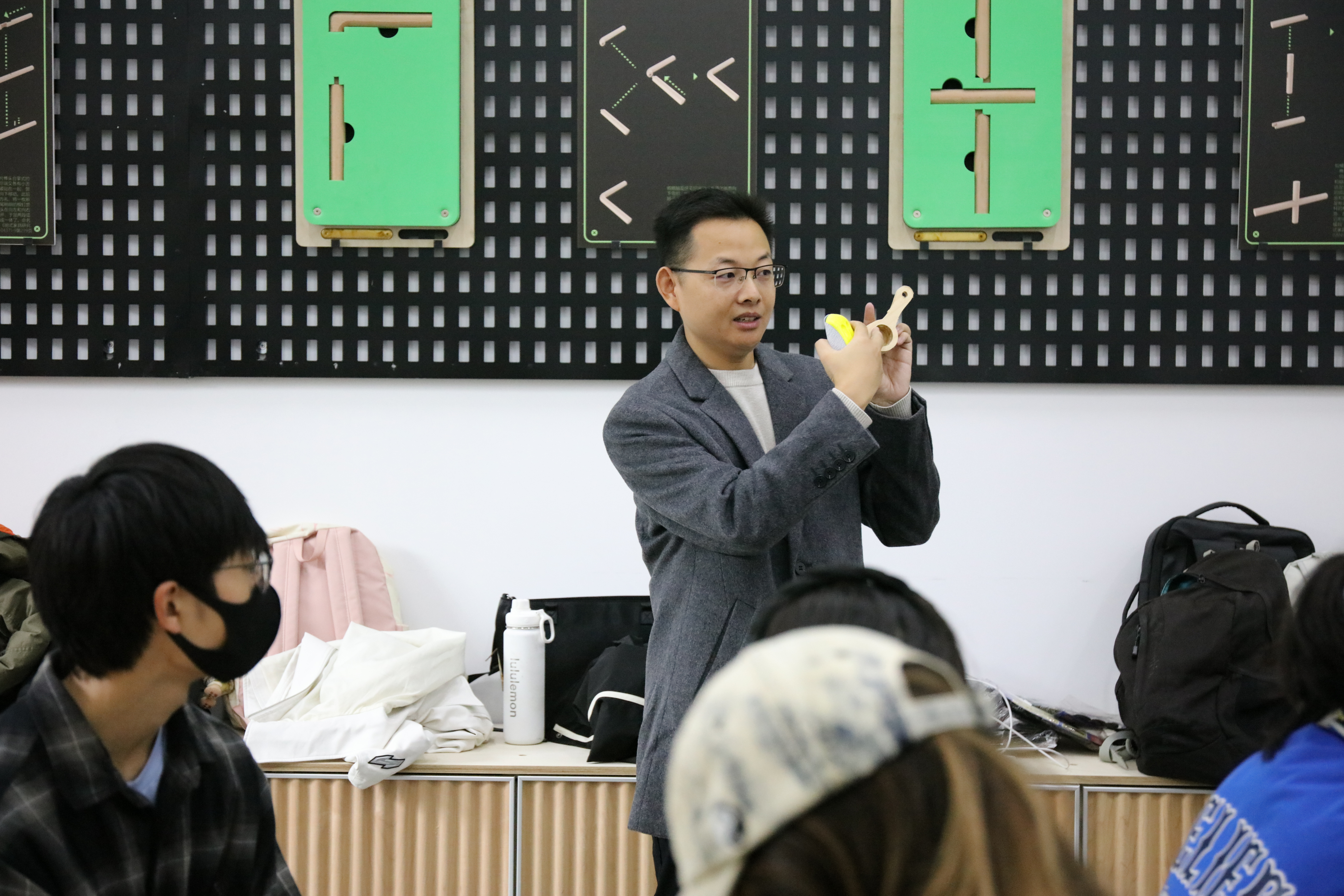 “光有想法還不夠,想法必須接近實際,要能落地才行?!边@一理念貫穿課程始終。在木工實踐環節中,從工具使用、材料特性、加工工藝等基礎知識學起,學生在實際動手打磨中不斷地反思設計合理性,并進行實時優化。任課教師董冰洋表示,“學生要在砂紙與木頭的反復摩擦中感知材料紋理、流線弧度,‘基礎不牢,地動山搖’,這些看似基礎的訓練,正是未來駕馭復雜產品設計的基石。”