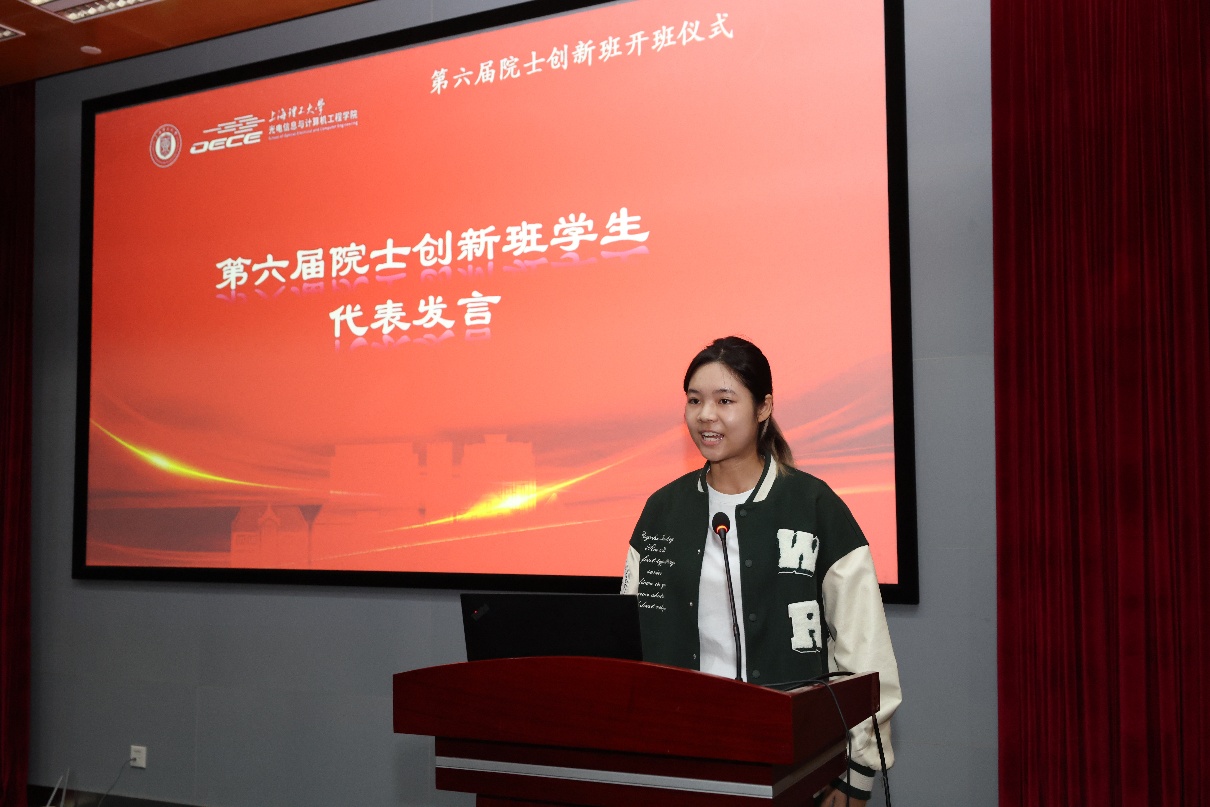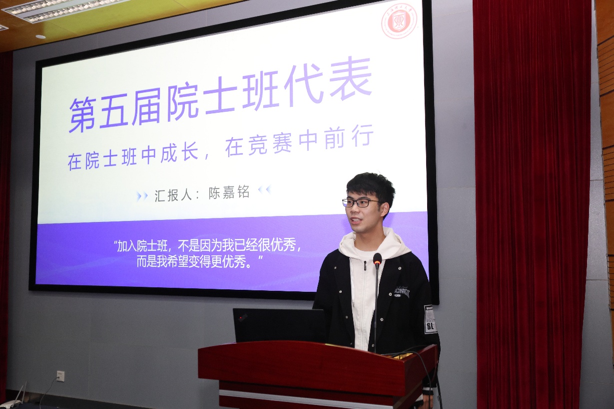 來自往屆的優秀學生代表分享了自己在院士創新班的學習經歷、科研收獲與感悟。第四屆學生代表黃昭鳳向分享了從“主動聯系教授加入課題組”到“從1到2實現創新突破”的成長路徑;第五屆學生代表陳嘉銘以“從渴望優秀走向實現優秀”為主題,講述了參與多項競賽的心路歷程,強調了充分準備和沉著應戰的重要性;新生代表郭旸表達了對院士創新班的向往與期待,并代表全體新生承諾將潛心學問、攜手共進、志存高遠。