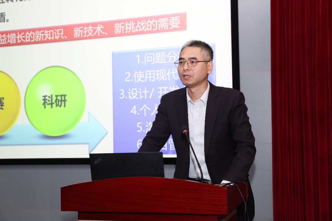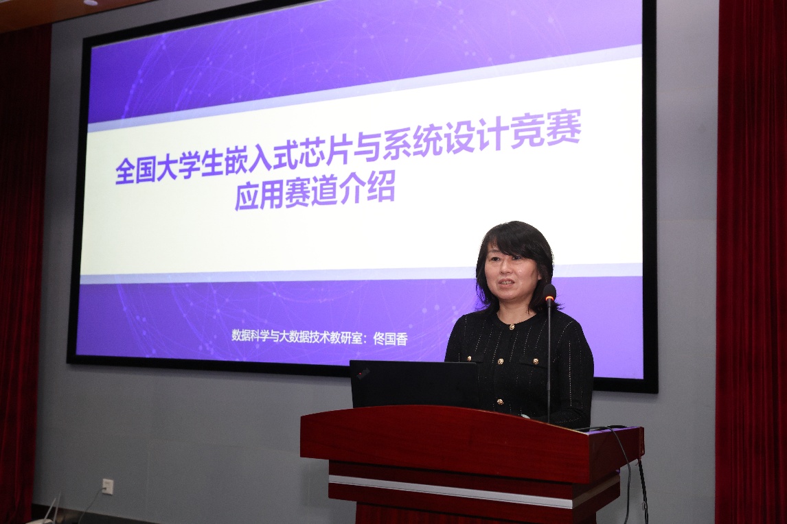 佟國香為學員們介紹了大學生嵌入式芯片與系統設計競賽的相關內容,分析了不同賽道的特點,并展示了學校歷年參賽成果,鼓勵同學們以賽促學,提升創新實踐能力。