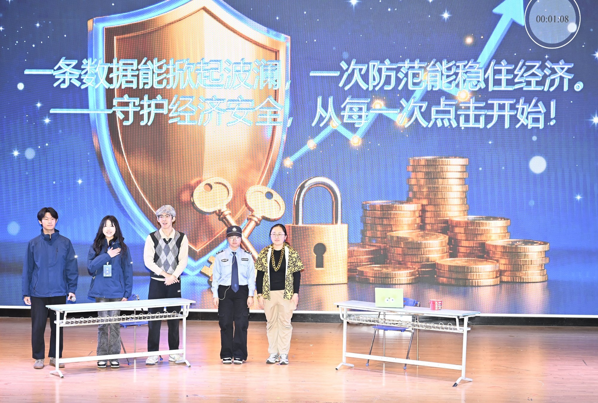 在安全公開課環節,參賽隊伍圍繞軍事、經濟、生態、政治、生物、資源、人工智能、社會等八大安全領域,以情景劇、小品等形式進行展示,體現大學生對國家安全的多元認知與創新表達。