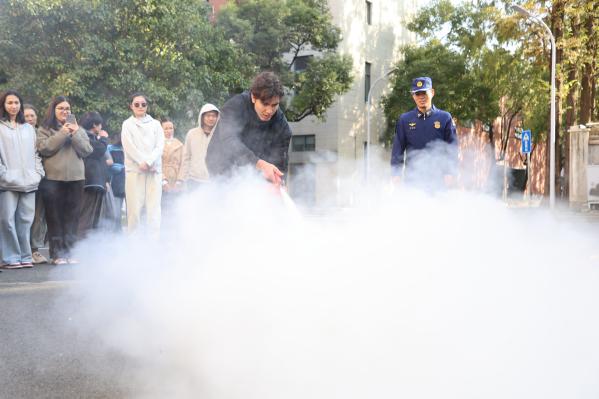 疏散結束后,消防官兵在宿舍門前空地開展滅火器實操教學,詳細講解干粉滅火器構造原理、操作步驟及安全要點,并進行現場示范。多名國際學生在專業(yè)指導下輪流實操,親身體驗初起火災撲救流程,切實掌握滅火技能。?