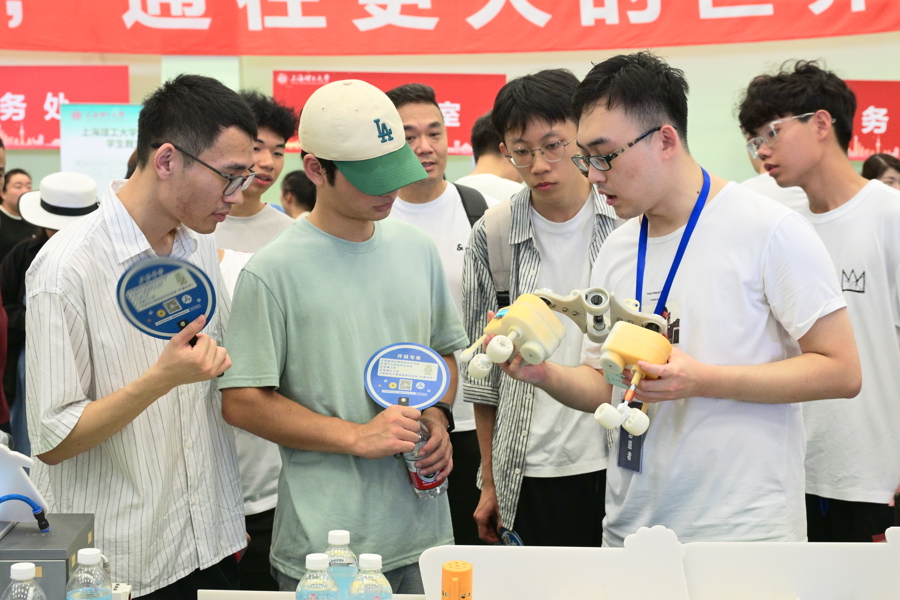 在機械工程學(xué)院的迎新展臺前,大四學(xué)長彭新宇熱情地向?qū)W弟學(xué)妹們“安利”他斬獲第十四屆上海市大學(xué)生機械工程創(chuàng)新大賽一等獎的“智能多功能可折疊按摩儀”。“它不僅能手機互聯(lián)一鍵調(diào)控,還能自由折疊拆卸,目前市面上還沒有同類產(chǎn)品……”彭新宇的介紹,引得新生們連連稱奇。展臺上,仿生蝴蝶、軟體管道爬行機器人、果樹剝殼機等一系列獲獎作品也同樣吸睛,讓新生近距離感受到智能制造的魅力。
